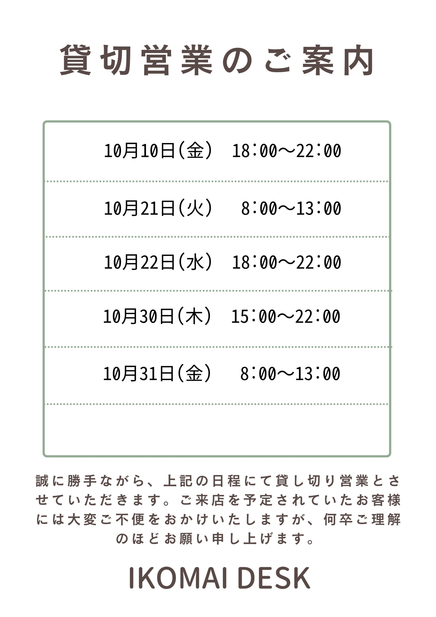 2025.09.30 貸し切り営業のお知らせ(10月) 誠に勝手ながら、以下の日程にて貸し切り営業とイベントを実施させていただきます。ご来店を予定されていたお客様には大変ご不便をおかけいたしますが、何卒ご理解のほどお願い申し上げます。 貸し切り営業のお知らせ(9月)