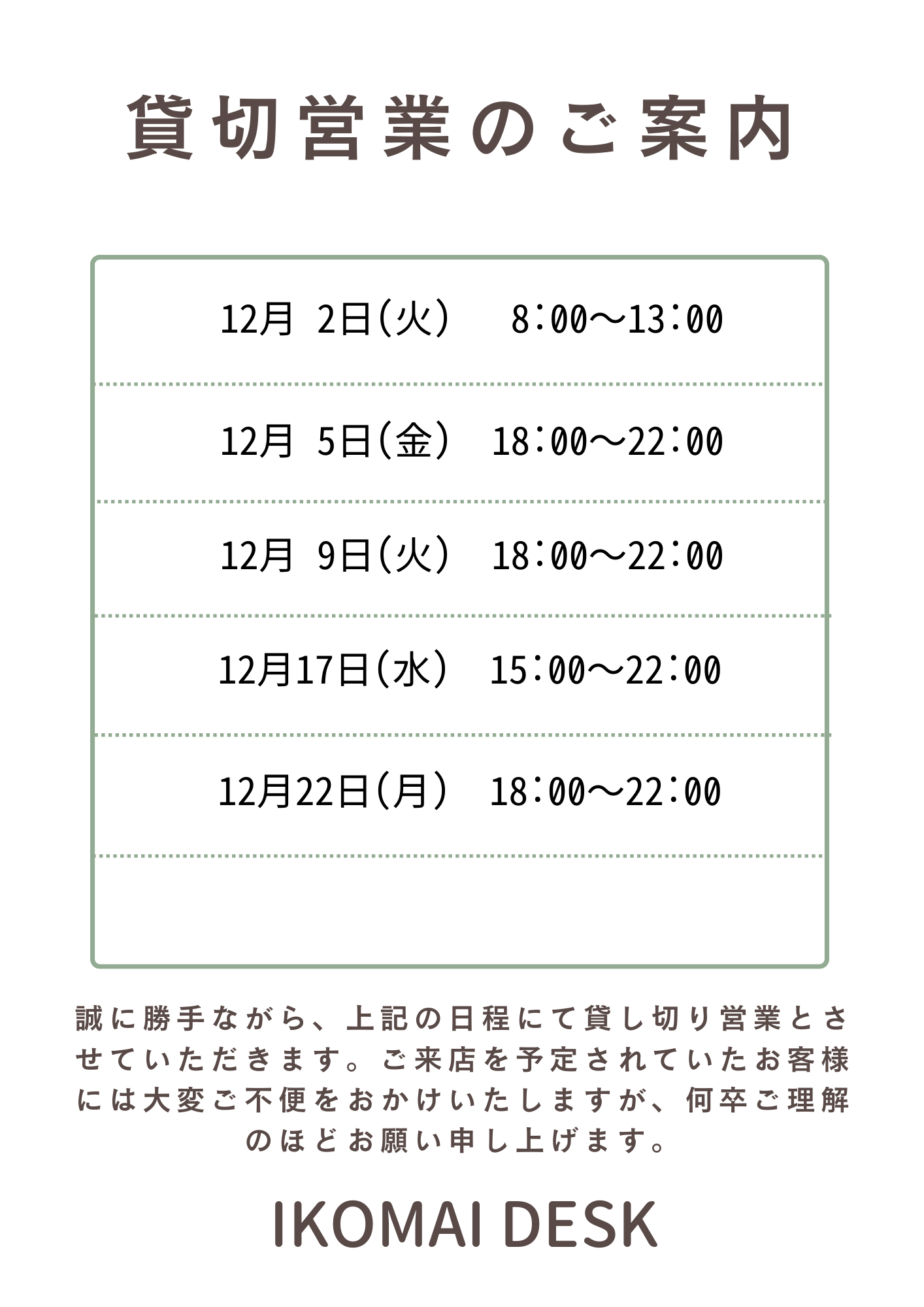 貸し切り営業のお知らせ(2/2・2/10・3/10)